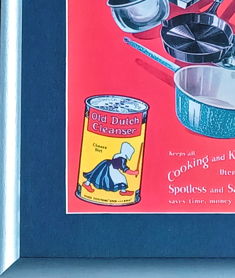 Kleurrijke afbeelding (in lijst) van een advertentie in de Ladies Home Journal van 1919: ‘Blue and White Agate Cookware Old Dutch Cleanser’.