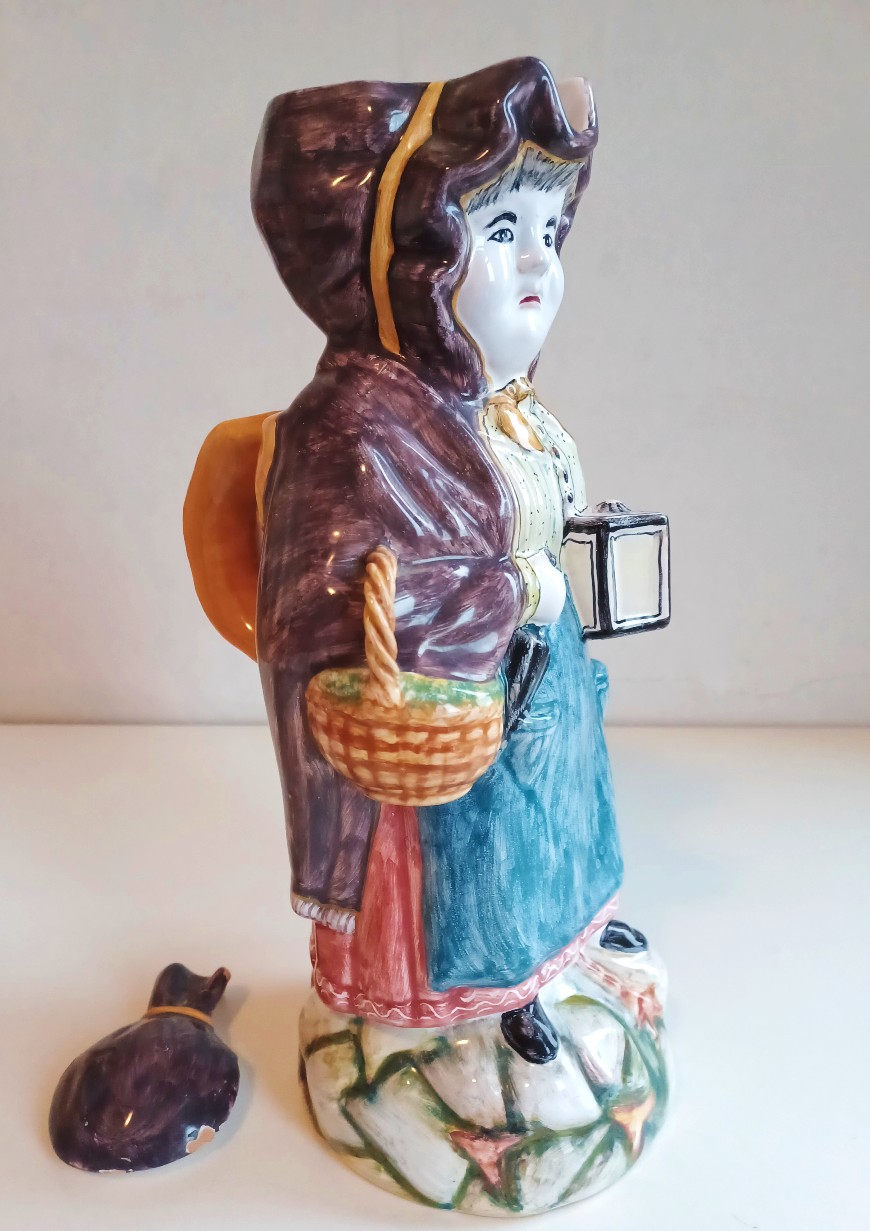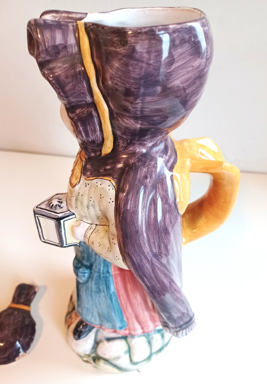 Een keramieken schenkkan in de vorm van een vrouwtje met een lantaarn in haar hand. De kan is polychroom geglazuurd en afkomstig uit Portugal.