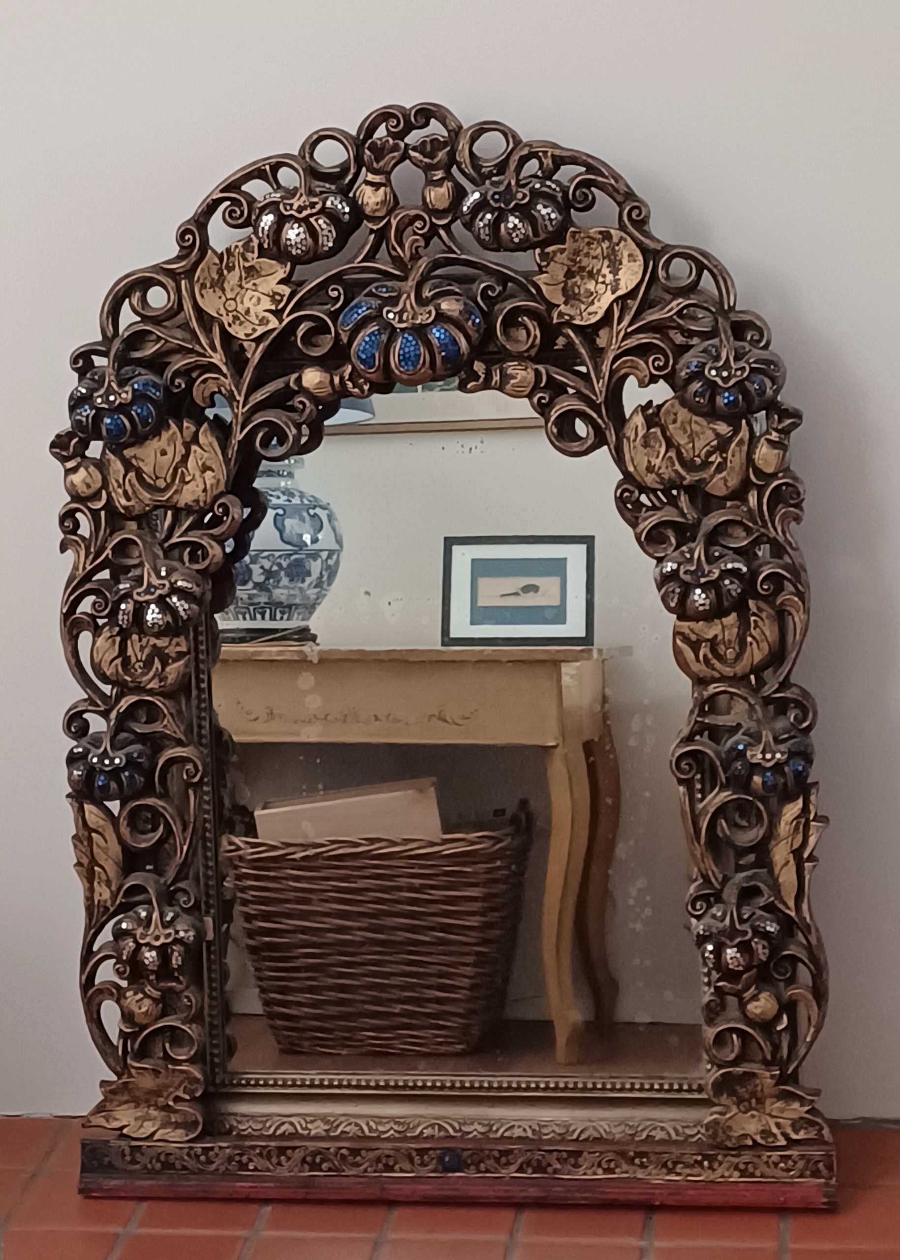 Deze spiegellijst komt vermoedelijk uit India. Opengewerkt hout, met prachtige blauwe, rode en gouden kleuren. De lijst is ingelegd met zilveren en blauwe stukjes glas.