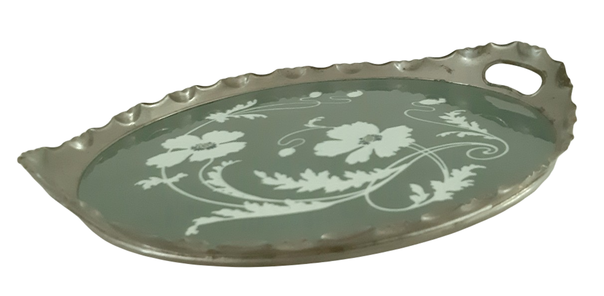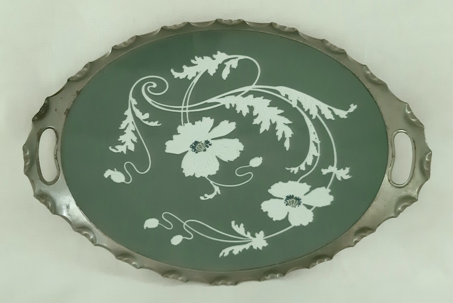 Dit jugendstil dienblad met metalen montuur is in de periode tussen 1874 en 1909 gemaakt door de bekende aardewerkfabriek Villeroy & Boch in Dresden (Duitsland) (merkje onderzijde blad).