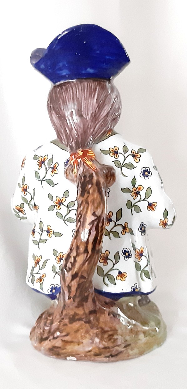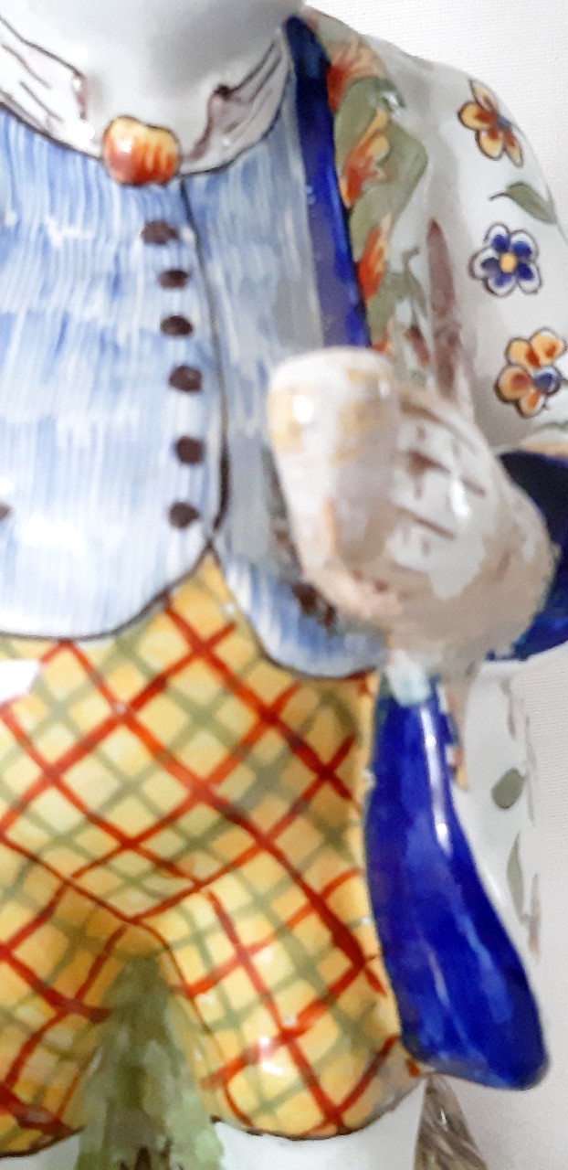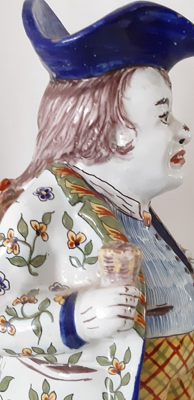 Hij is een van onze favorieten, deze Franse Monsieur, uit circa 1900. Een ‘Toby Jug’ van een ietwat onvriendelijk kijkende man. De kleuren en details van deze kan zijn fantastisch. Let bijvoorbeeld op de tekening van zijn kleurrijke jas. Gesigneerd op de onderzijde, waarschijnlijk voor Fourmaintraux. Minieme restauratie aan hoed en pijp, kleine beschadiging bij de mond, voor de rest helemaal gaaf.