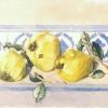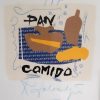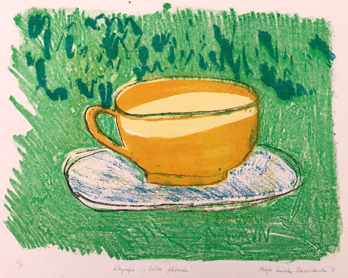 Een lithografie van een oranje kop met blauwe schotel tegen een groene achtergrond, genummerd 2/4. Titel ‘Zo’ita filiiankam’ en gesigneerd Alicja Lewicka 1991. Groot formaat.