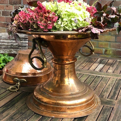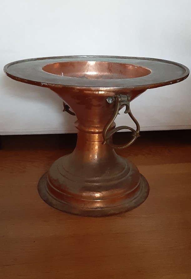 Voor deze Spaanse brasero uit het midden van de 19e eeuw lopen we echt warm. De roodkoperen (vuur)schaal met deksel staat op een hoge poot en heeft handvatten van geelkoper. Hij heeft een prachtig groot formaat en is nog helemaal intact.