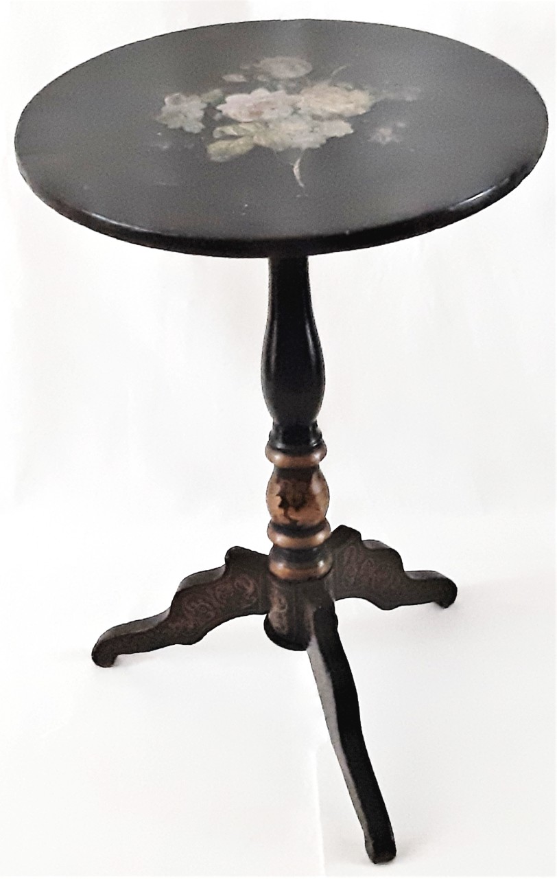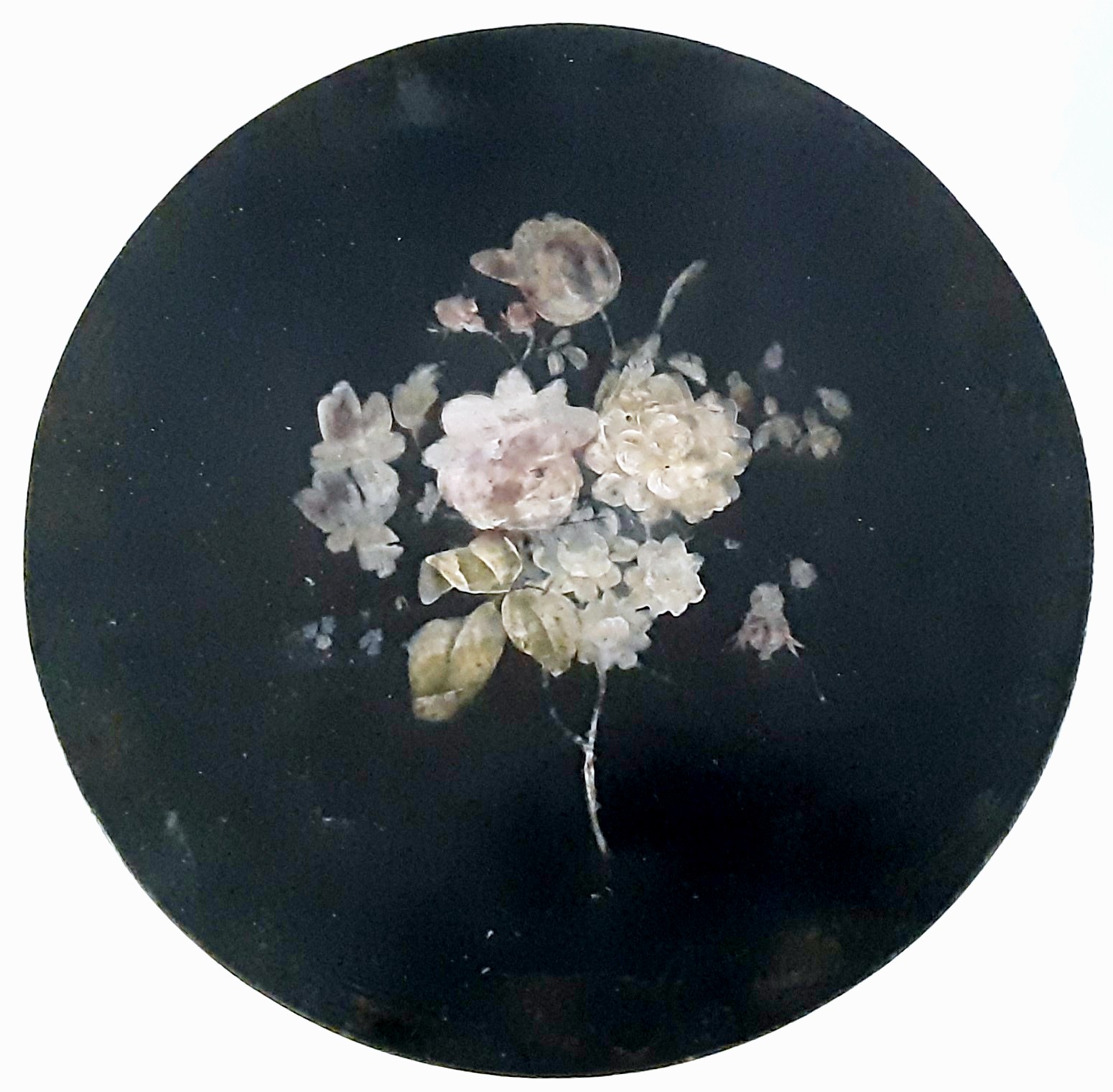 Het fraaie bloemmotief is in pasteltinten en goud aangebracht op de mat zwart gelakte onderlaag van zowel blad als onderstel. Het tafeltje is in goede staat.